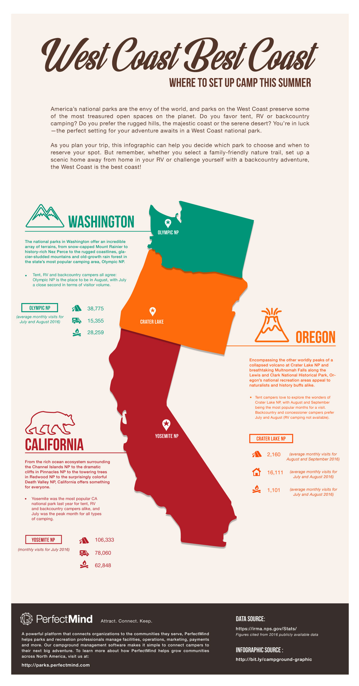 As you plan your trip, this infographic can help you decide which park to choose and when to reserve your spot. But remember, whether you select a family-friendly nature trail, set up a scenic home away from home in your RV or challenge yourself with a backcountry adventure, the West Coast is the best coast!